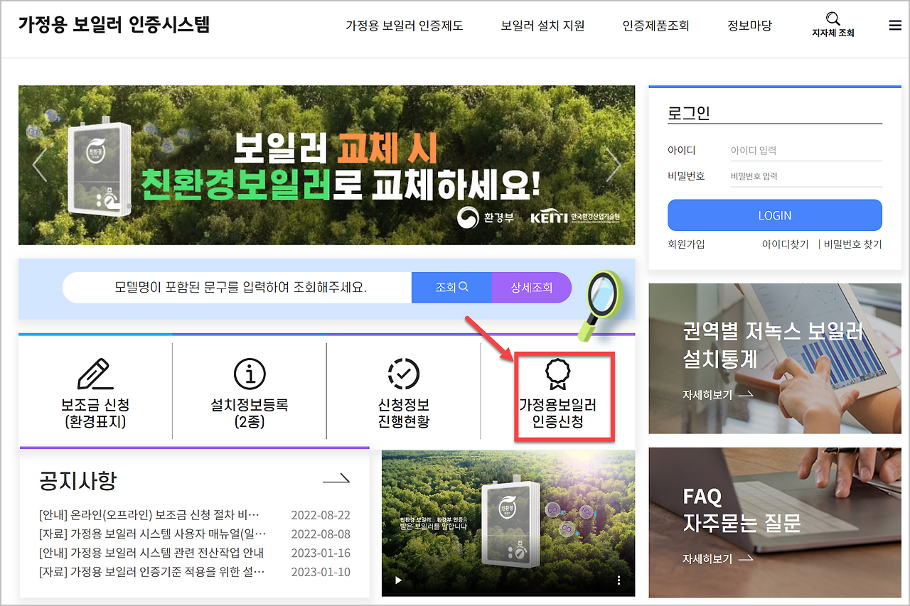 아래 링크를 통해 가정용 보일러 인증 시스템에 접속할 수 있으며, 이곳에서 인증 신청은 물론, 저녹스 보일러로 인증된 제품 목록도 함께 확인할 수 있습니다.