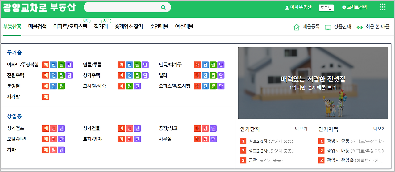 해당 링크를 클릭하면 광양 교차로 메인 페이지로 이동하게 됩니다. 이곳에는 부동산과 관련된 내용을 확인할 수 있는 메뉴가 눈에 띄는 위치에 배치되어 있어 쉽게 접근할 수 있습니다.