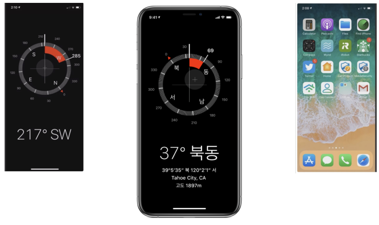 아이폰 사용자라면 별도로 앱을 설치할 필요가 없습니다. 아이폰에는 기본적으로 ‘나침반’ 앱이 설치되어 있어, 앱을 실행하면 곧바로 사용할 수 있습니다. 앱을 실행한 뒤, 화면에 표시되는 십자선을 중심에 맞추면 보다 정확한 방향을 확인할 수 있습니다. 하단에는 고도와 방향 좌표가 함께 표시되며, 스마트폰을 회전할 때마다 방향도 실시간으로 바뀝니다.