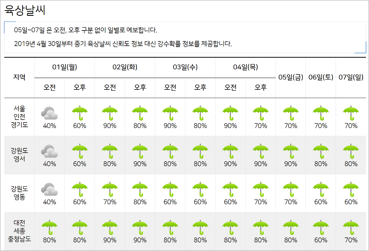 해당 페이지에 들어가면 아래와 같은 방식으로 예보가 제공됩니다. 7일간의 강수 여부를 확인할 수 있으며, 날씨 흐름을 한눈에 파악할 수 있도록 정리되어 있습니다.