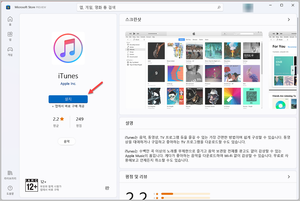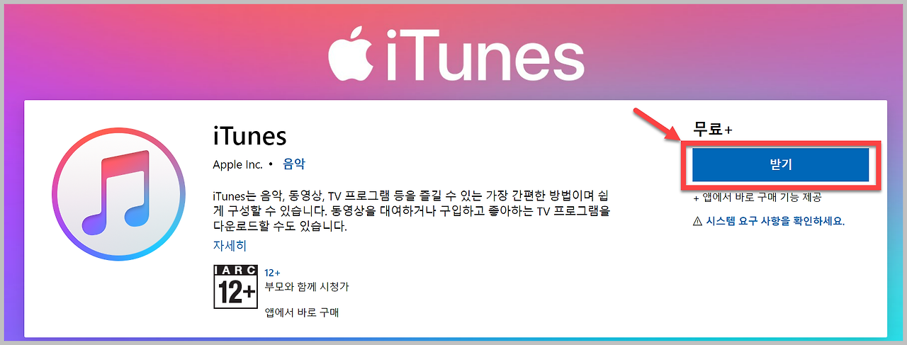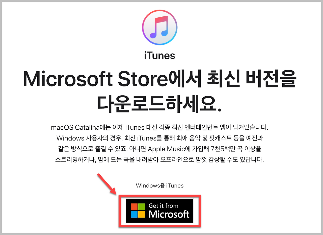 이 소프트웨어를 설치하려면 아이튠즈 공식 다운로드 페이지에 접속하면 됩니다. 예전에는 이 페이지에서 직접 설치 파일을 내려받을 수 있었지만, 현재는 Microsoft Store를 통해 설치하도록 방식이 바뀌었습니다.