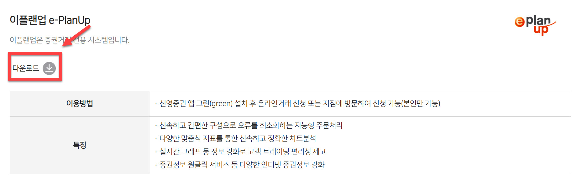 신영증권의 HTS의 이름은 이플랜업 (e-PlanUp) 입니다. 신영증권에서 이야기 하는 장점은 아래와 같습니다.
