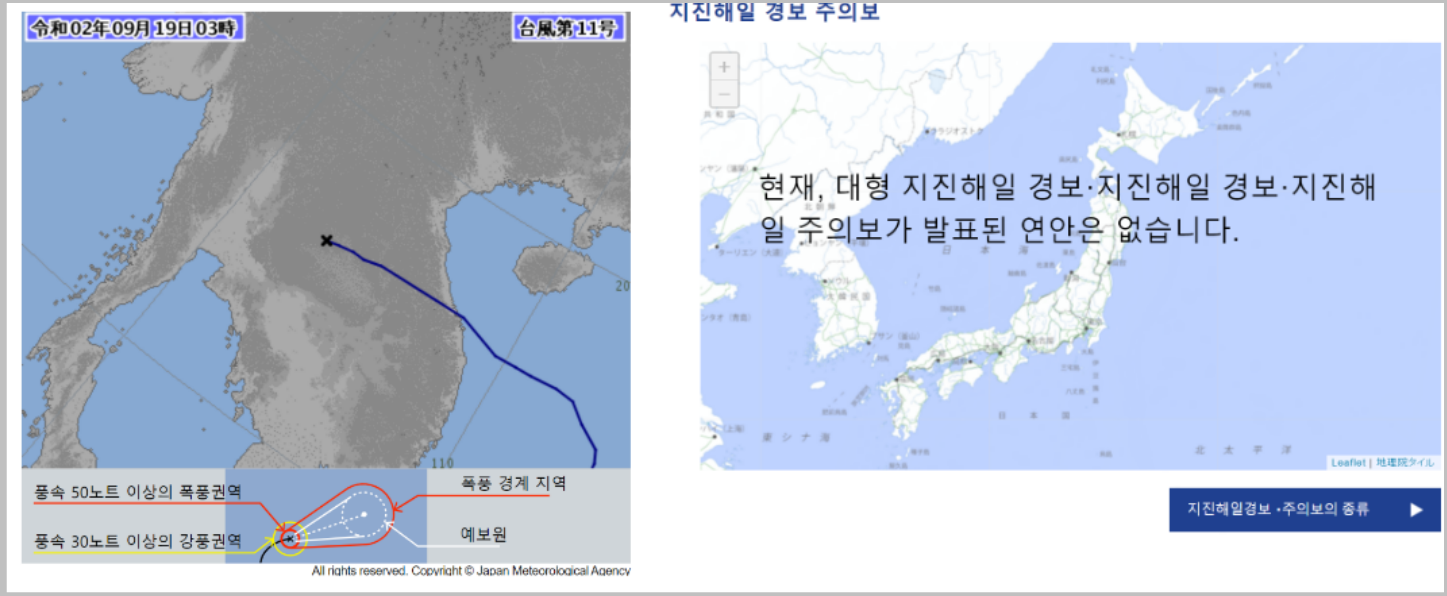 위 링크를 통해 다음과 같은 화면의 일본 기상청 한글판을 확인할 수 있습니다. 여행객들을 위해서 일기예보는 물론이고 일본에서 많이 발생하는 태풍, 쓰나미, 지진, 화산등의 정보를 한국어로 볼 수 있습니다.