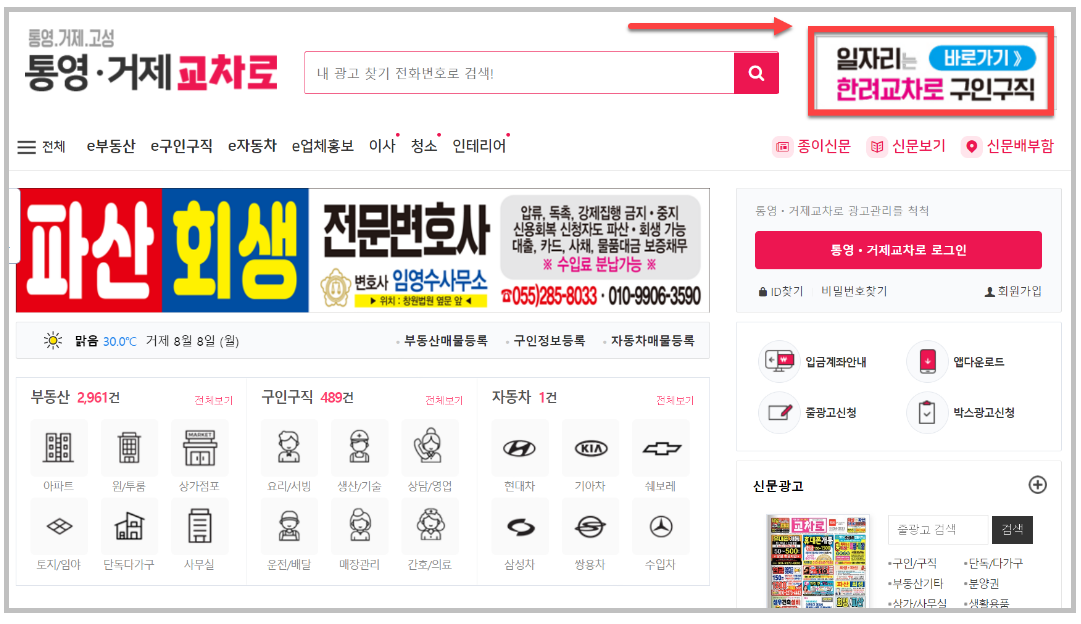 교차로홈페이지에서 배너를 눌러서 이동하는 것보다 위 링크를 클릭하면 통영거제 교차로 구인구직 홈페이지로 한번에 넘어갈 수 있습니다. 또는 한려교차로 구인구직이라고 검색엔진에 검색해도 같은 결과를 얻을 수 있습니다.