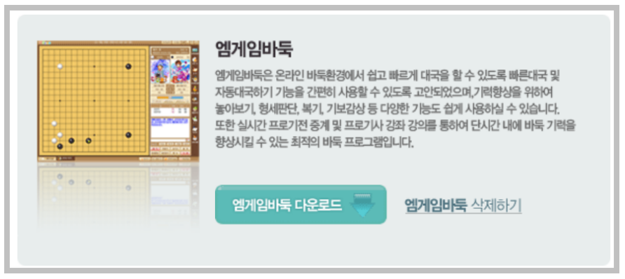 로그인을 한 이후에는 대국실 입장 하단에 있는 다운로드를 클릭하면 다음과 같은 화면을 볼 수 있습니다. 다음 화면에서 엠게임바둑 다운로드를 클릭하면 바로 설치가 가능합니다. 위 이미지는 사진이기 때문에 사진을 클릭해도 다운받을 수 없으니 제가 위에 올려둔 링크를 통해 접속하시길 바랍니다.