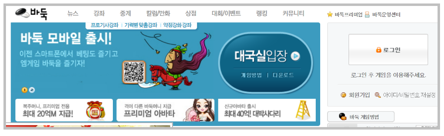 링크를 통해 접속하면 다음과 같은 화면을 확인할 수 있습니다. 대국실 입장 버튼 하단부를 확인하면 다운로드 링크가 있습니다. 다운로드를 하기 위해서는 위 버튼을 클릭하면 됩니다. 다만 그전에 엠게임 로그인을 먼저 진행해야합니다. 만약 회원가입을 하지 않은 상태라면 회원가입을 한 후에 로그인을 다시해야합니다.