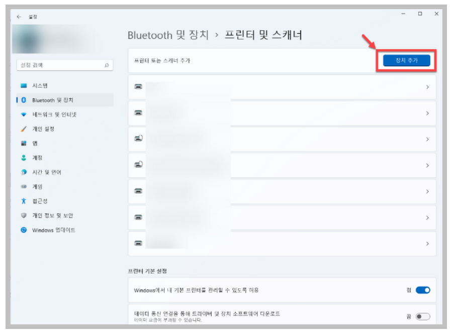 다음과 같은 순서로 프린터 및 스캐너 에 들어가면 다음과 같은 화면을 확인 할 수 있습니다. 화면 제일 상단부에 프린터 및 스캐너 추가에 ‘장치추가’를 클릭하면 됩니다. 여기에서 본인이 새로 구매한 스캐너의 제품명을 찾고 선택하면 됩니다. 주변에 있는 모든 기기들이 뜨는데 그중에서 본인이 연결해야하는 스캐너를 잘 선택하는 것 이 중요합니다. 컴퓨터와 스캐너를 연결하는 과정입니다.