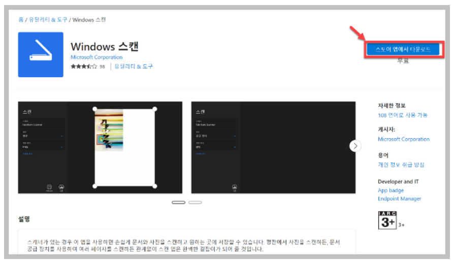 다음과 같은 앱이 나오면 다운로드를 클릭해서 다운을 받으면 됩니다. 무료이며 별도의 과정 없이 바로 문서를 스캔하고 저장할 수 있다는 것이 장점입니다.