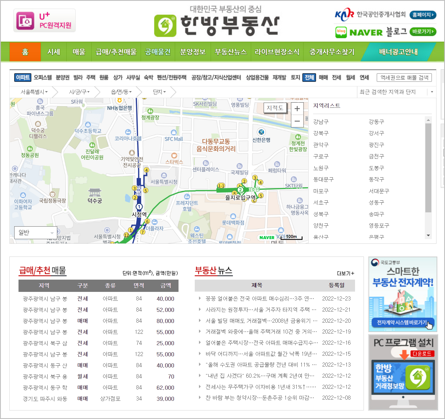 이곳으로 들어가시면 한방 부동산 포털을 이용하실 수 있습니다. 홈페이지에 들어가면 아래와 같은 여러가지 정보를 확인할 수 있습니다.