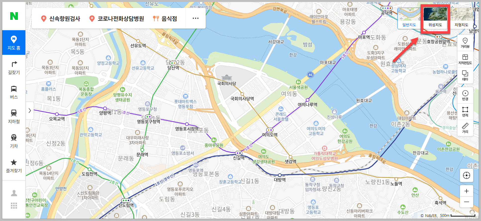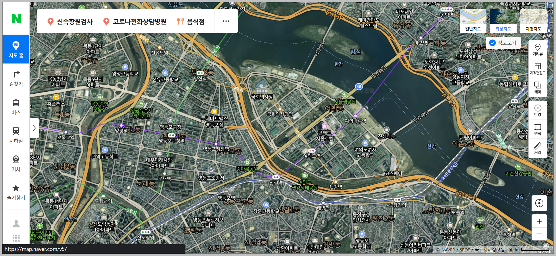 여의도의 위성모습은 위와 같습니다. 일반 지도로 보는것보다 훨씬더 쉽게 다가옴을 느낄 수 있습니다. 위성으로 바뀐다고 해서 많은 지시선(?)들이 사라지지는 않습니다. 도리어 더 잘보이도록 변경이 되는것 같습니다.