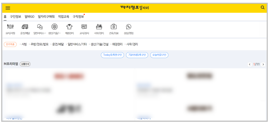 이번 포스팅은 구인구직에 관련한 내용이기 때문에 일자리를 클릭해서 들어가면 다음과 같은 화면을 볼 수 있습니다. 교차로와 정말 비슷하다는 느낌을 받을 수 있는데 교차로와 마찬가지로 업종별로 분류해서 일자리 광고를 제공하고 있음을 확인할 수 있습니다.