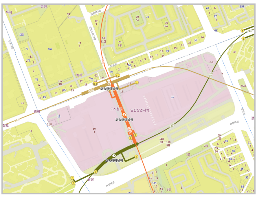 이렇게 조금더 확대해서 고속터미널 역을 살펴보면 녹지지역인지, 공원인지, 도시철도인지, 광장인지, 일반상업지역인지 제1종 일반주거지역인지를 확인할 수 있습니다. 색상으로도 뚜렷하게 구분할 수 있습니다.