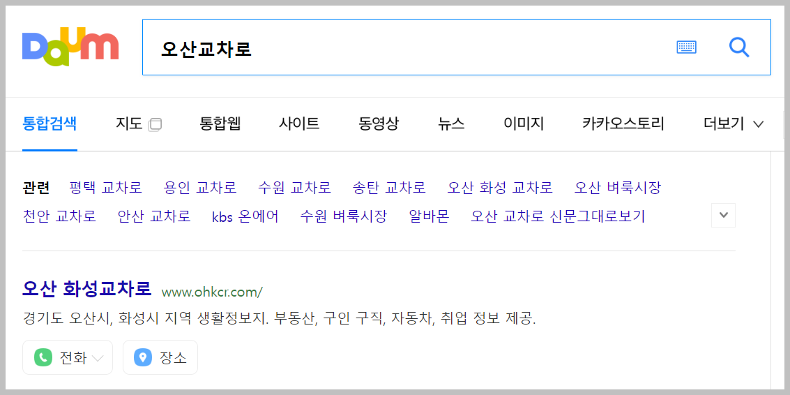 위의 이미지는 다음에서 "오산교차로"라고 검색했을 때의 결과입니다. 첫 번째로 나타난 것이 우리가 원하던 것입니다. 이것을 이용하시면 쉽게 해당 홈페이지로 들어갈 수 있습니다.