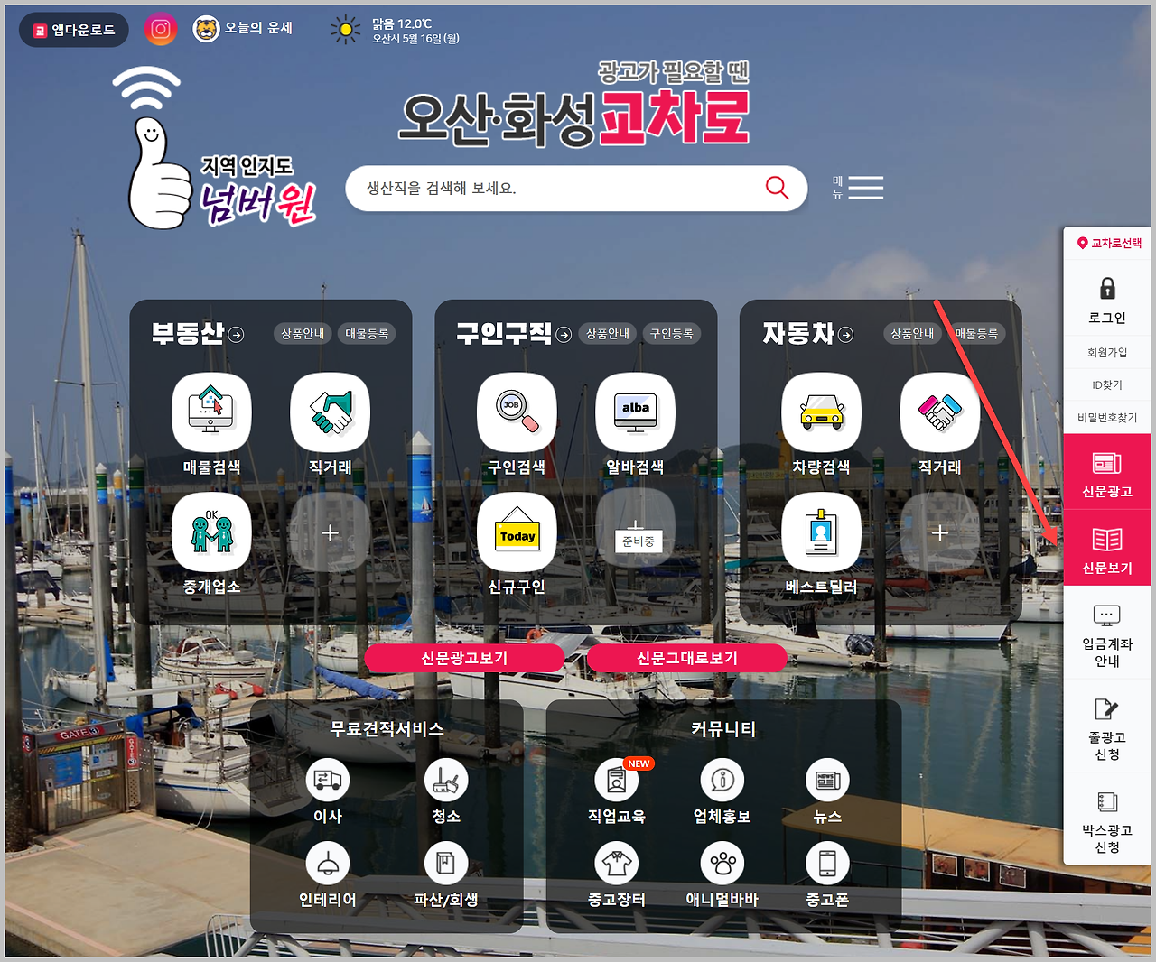 오산교차로 웹사이트에 들어가면 이런 화면이 뜹니다. 여기에는 다양한 정보들이 보이는데요, 오른쪽을 보면 '신문보기'라고 되어 있습니다. 이것을 클릭하면 이북 형태로 오산화성교차로 신문을 볼 수 있습니다. 이북 형태의 장점은 신문 내용을 그대로 볼 수 있어 익숙하다는 것입니다.