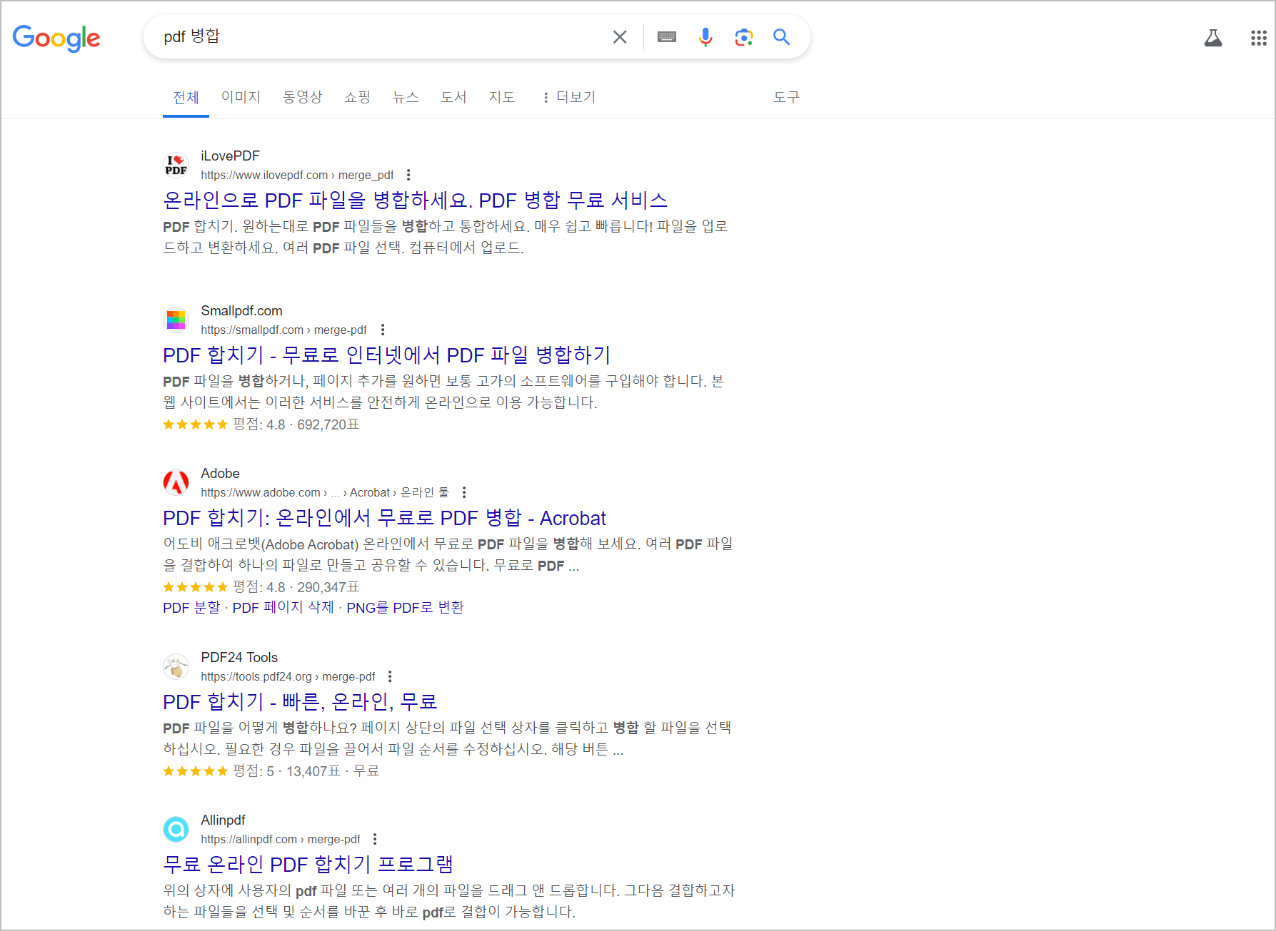 PDF 병합사이트는 AllinPDF 만 존재하는게 아닙니다. 구글에서 피디에프합치기 가라고 검색을 하면 수도 없이 많이 나오게 됩니다. 이중에서 자기가 선호하는 인터페이스를 선택하셔서 하면됩니다. 기능적으로는 큰 차이가 없기 떄문에 편리한것을 이용하시면 됩니다..