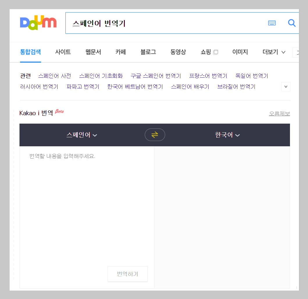 다음 검색창에 '스페인어 번역기'를 입력하면 카카오 아이번역기가 나옵니다. 여기서 스페인어를 입력하면 자동으로 한국어로 번역이 되는 시스템입니다.
