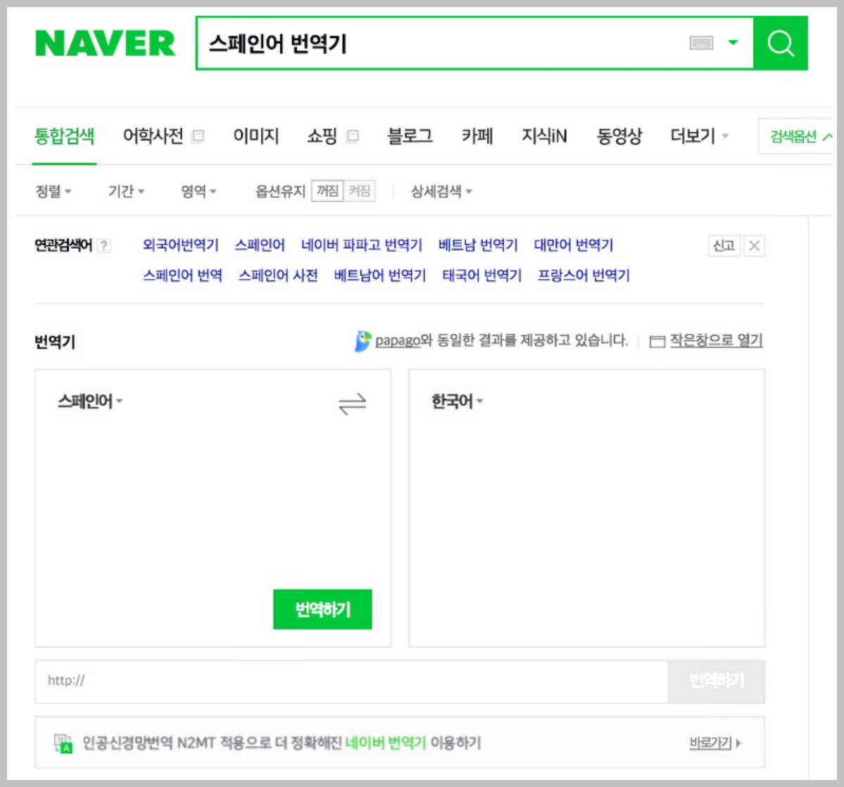 네이버에서 '스페인어 번역기'를 검색하면 스페인어 번역기가 나타납니다. 그 성능은 구글에 비해 우수한 것으로 평가됩니다.