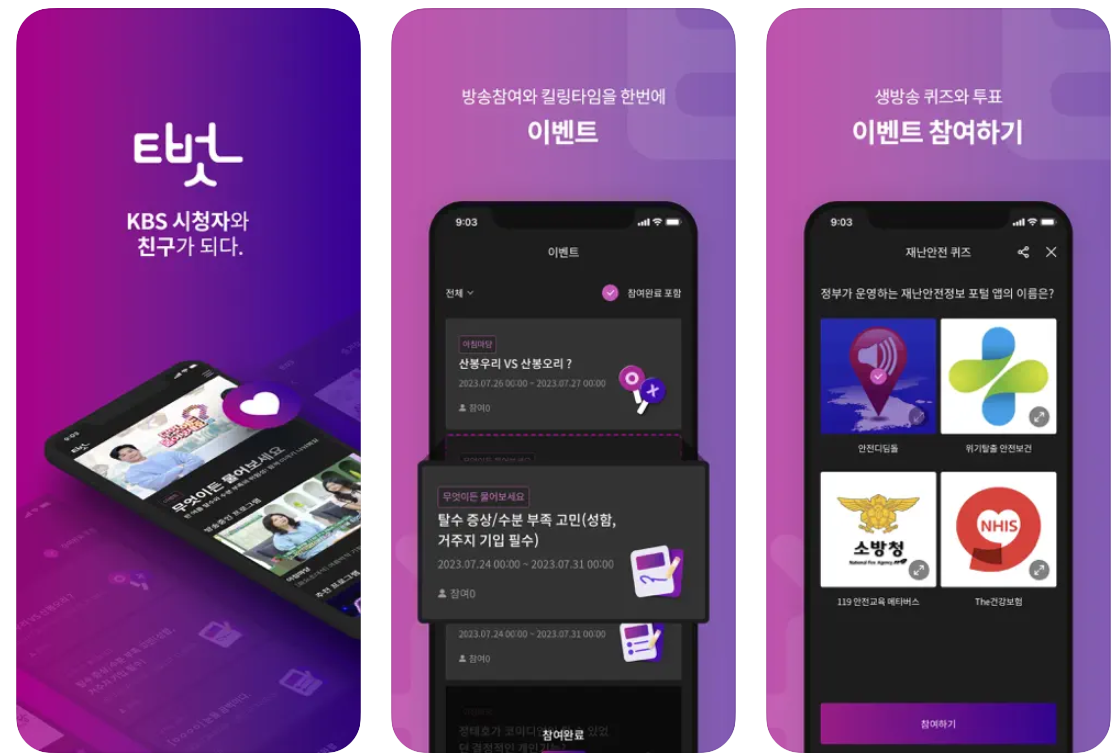 안드로이드와 아이폰 모두에서 티벗 아침마당참여하기가 가능합니다. 과거에는 아이폰 어플의 품질이 굉장히 안좋았을때도 있었는데, 요즘에는 둘 다 괜찮습니다. 앱을 다운로드하려면 플레이스토어나 앱스토어에서 'KBS 티벗'을 검색하거나, 아래 링크를 클릭해도 됩니다.