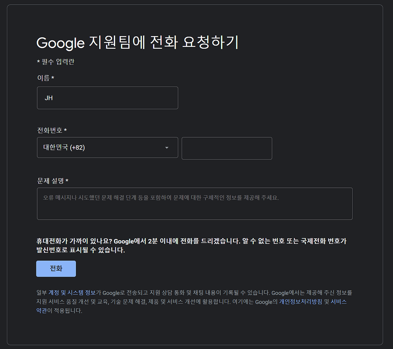 검색 서비스나 기타 구글 제품에 대한 기술 지원이 필요할 경우, 전화 상담 요청을 할 수 있는 별도의 지원 페이지도 제공됩니다. 해당 페이지에 접속하면 담당 부서로부터 연락을 받을 수 있도록 신청할 수 있습니다. 이 방법이 일반적인 문의보다 더 빠를 수 있습니다.