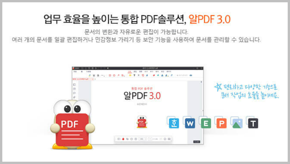 PDF 파일은 본래 편집을 염두에 두고 만들어진 형식이 아니기 때문에, 원본 수정이 필요할 경우에는 보통 유료 소프트웨어를 이용해 한글이나 워드 파일로 변환한 후 편집하는 방식이 일반적입니다. 하지만 무료로 제공되는 알PDF에서도 이러한 변환 기능을 제공하고 있으며, 주석 달기나 문서 병합, 분할과 같은 기본적인 편집도 가능합니다.