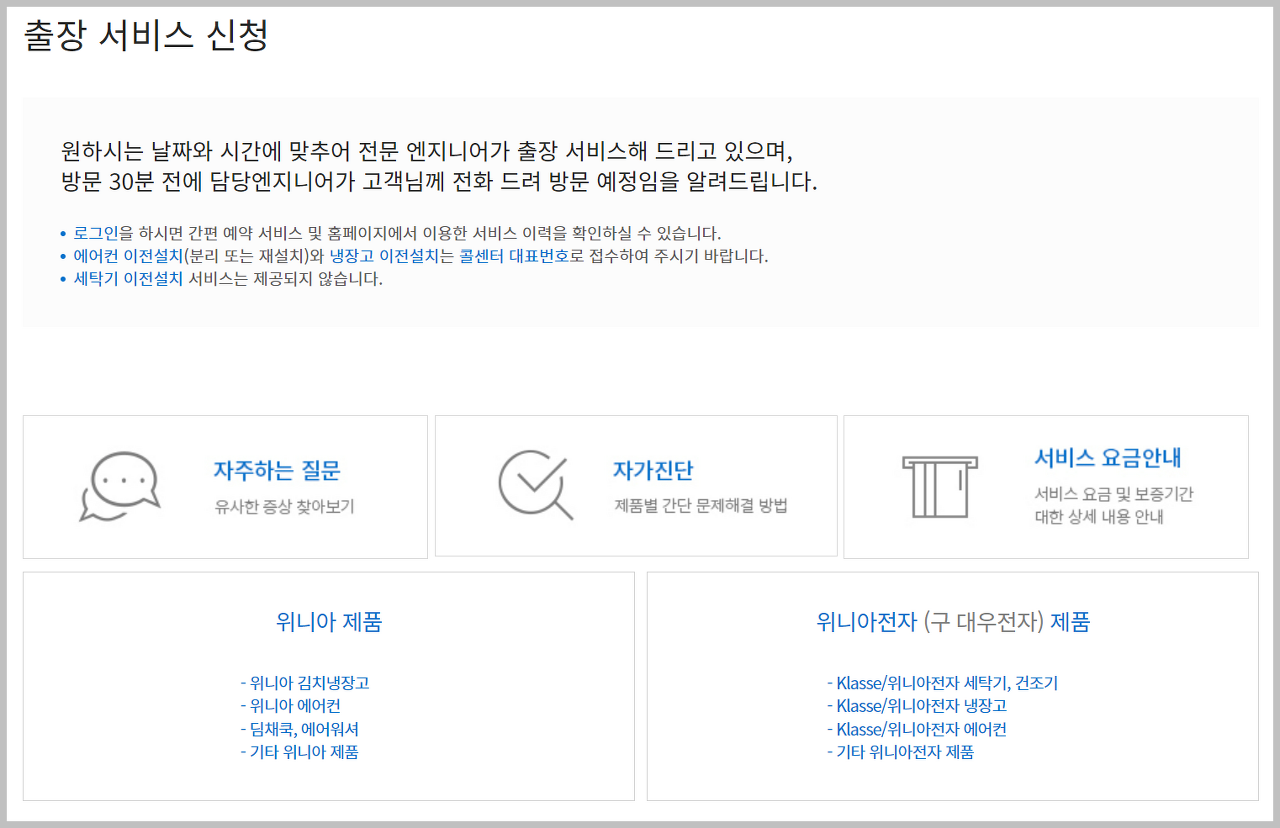문제가 간단한 수준을 넘는 경우, 위니아는 출장 서비스 접수도 제공합니다. 온라인으로 원하는 날짜와 시간에 맞춰 전문 엔지니어가 방문하여 제품을 점검해주는 서비스입니다. 다만 일반적인 점검이나 고장 수리에 한하며, 이사나 설치 이전 요청 등은 고객센터 전화로 별도 접수해야 합니다.