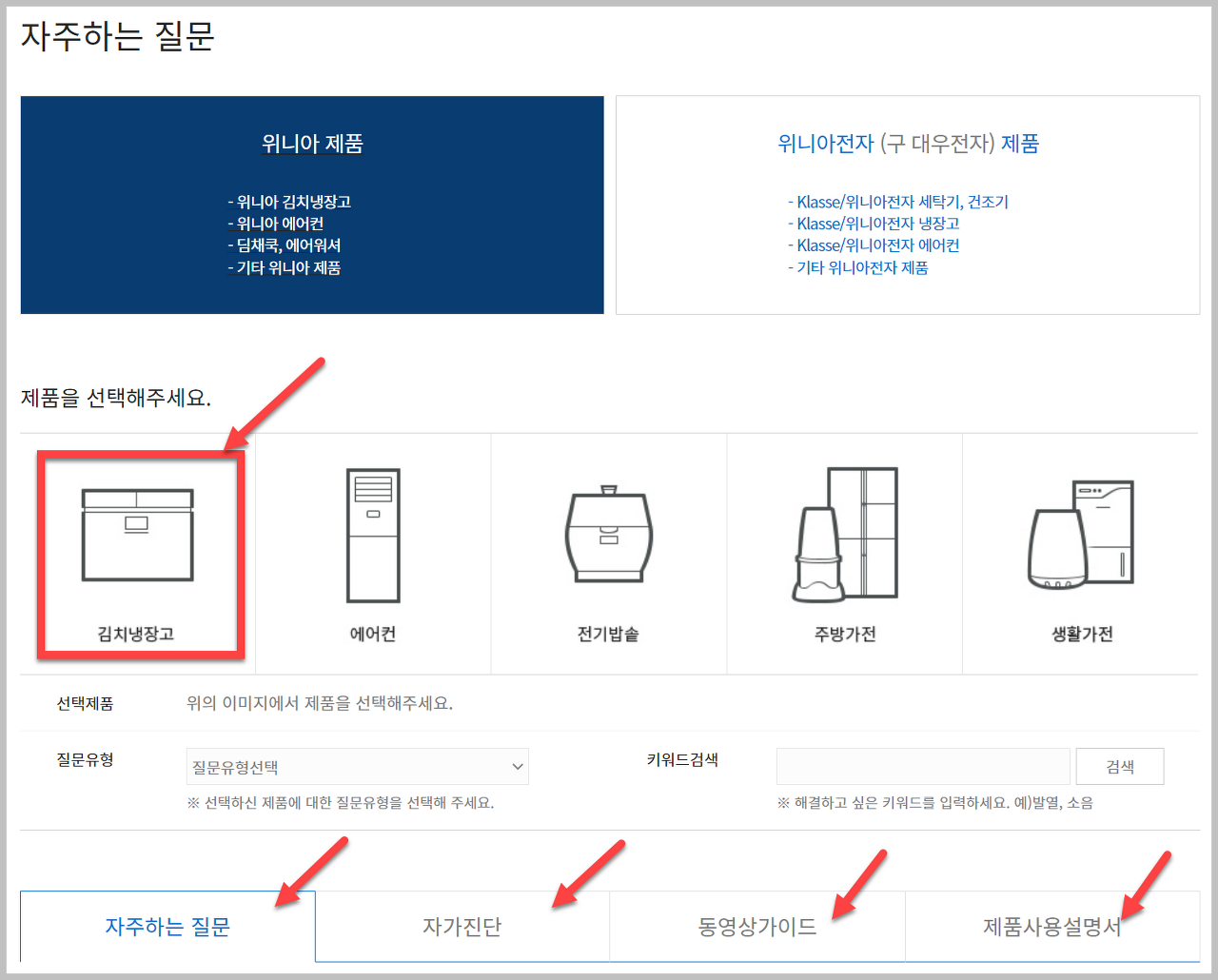 딤채 제품을 사용하는 중 문제가 발생했다면, 고객센터에 문의하기 전에 공식 홈페이지에 접속해 ‘자가진단’ 기능을 활용해보는 것이 좋습니다. 홈페이지에서는 김치 보관 중 냉동 현상, 소음 발생, 결로 등 자주 겪는 문제에 대한 해결법을 항목별로 안내하고 있습니다.