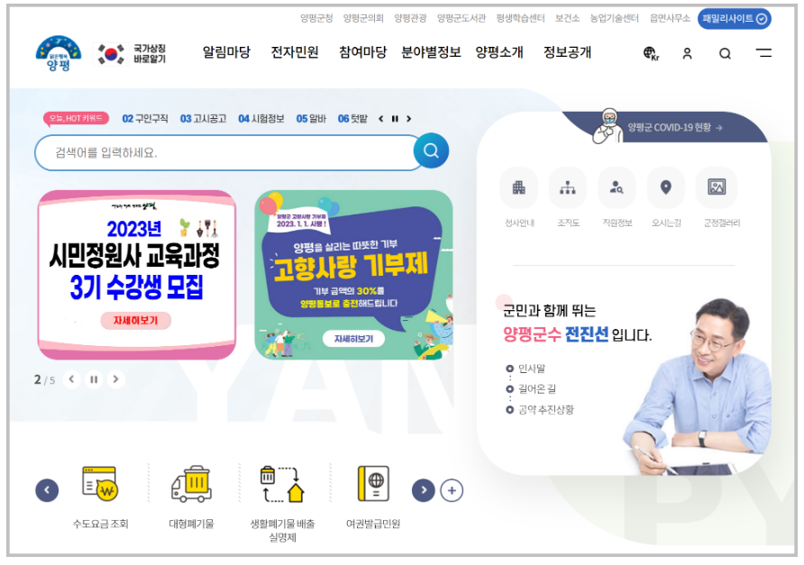 가장 일반적인 방법은 포털사이트에서 ‘양평군청’을 검색해 공식 홈페이지에 접속하는 것입니다. 예전에는 군청 메인페이지에 일자리와 관련된 배너가 있어 쉽게 찾을 수 있었지만, 현재는 블로그나 페이스북과 같은 SNS 홍보 콘텐츠가 중심에 배치되어 있는 경우가 많습니다.