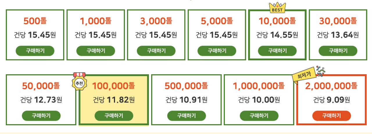 단문은 1건에 1톨, 장문은 3톨, 포토문자는 6톨이 소요됩니다. 이 씨앗은 구매량에 따라 할인율이 달라지며, 유효기간은 365일입니다. 예를 들어 200만 톨을 대량 구매할 경우, 1톨당 약 9.09원으로 할인되며, 반대로 소량인 500톨 구매 시에는 1톨당 약 15.45원 수준입니다. 따라서 단기간에 대량 발송이 필요한 경우라면, 씨앗을 미리 구매해두는 것이 비용 면에서 유리합니다.