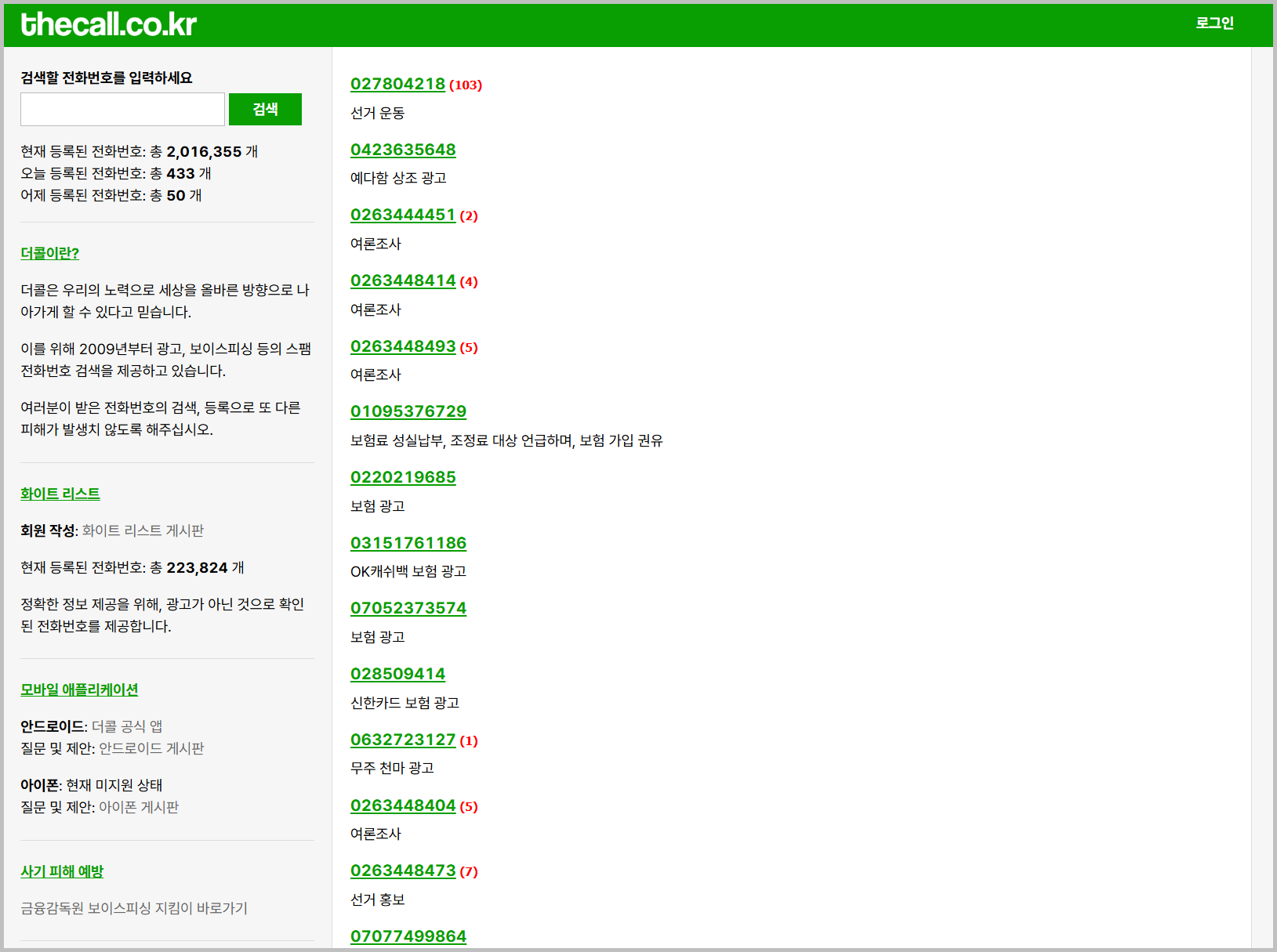 다음으로 소개할 사이트는 ‘더콜(TheCall)’입니다. 개인적으로 자주 활용하는 사이트로, 스팸 신고가 활발하게 이루어지는 편입니다. 특히 안드로이드 사용자라면 모바일 앱을 통해 더욱 편리하게 이용할 수 있습니다. 아이폰은 현재 미지원입니다.